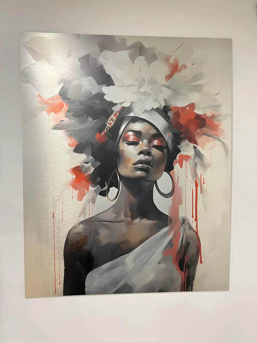 Experience the captivating allure of the Abstract Diva Aluminium Print. Printed on high-quality aluminium, the glossy hues and striking colors bring this stunning artwork to life. Featuring a beautiful African woman with abstract elements in silver, red, and white, this metal print will add a touch of elegance and vibrancy to any space.