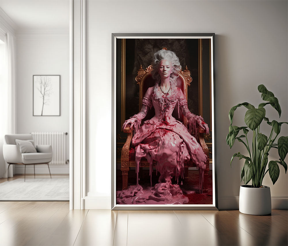 Our modern Ice Cream Queen wall art canvas print. This stunning piece features a beautiful queen seated on her throne with melting ice cream across her body and dress. Ice Cream Queen invites you to infuse your home with a touch of royal beauty and modern artistry.