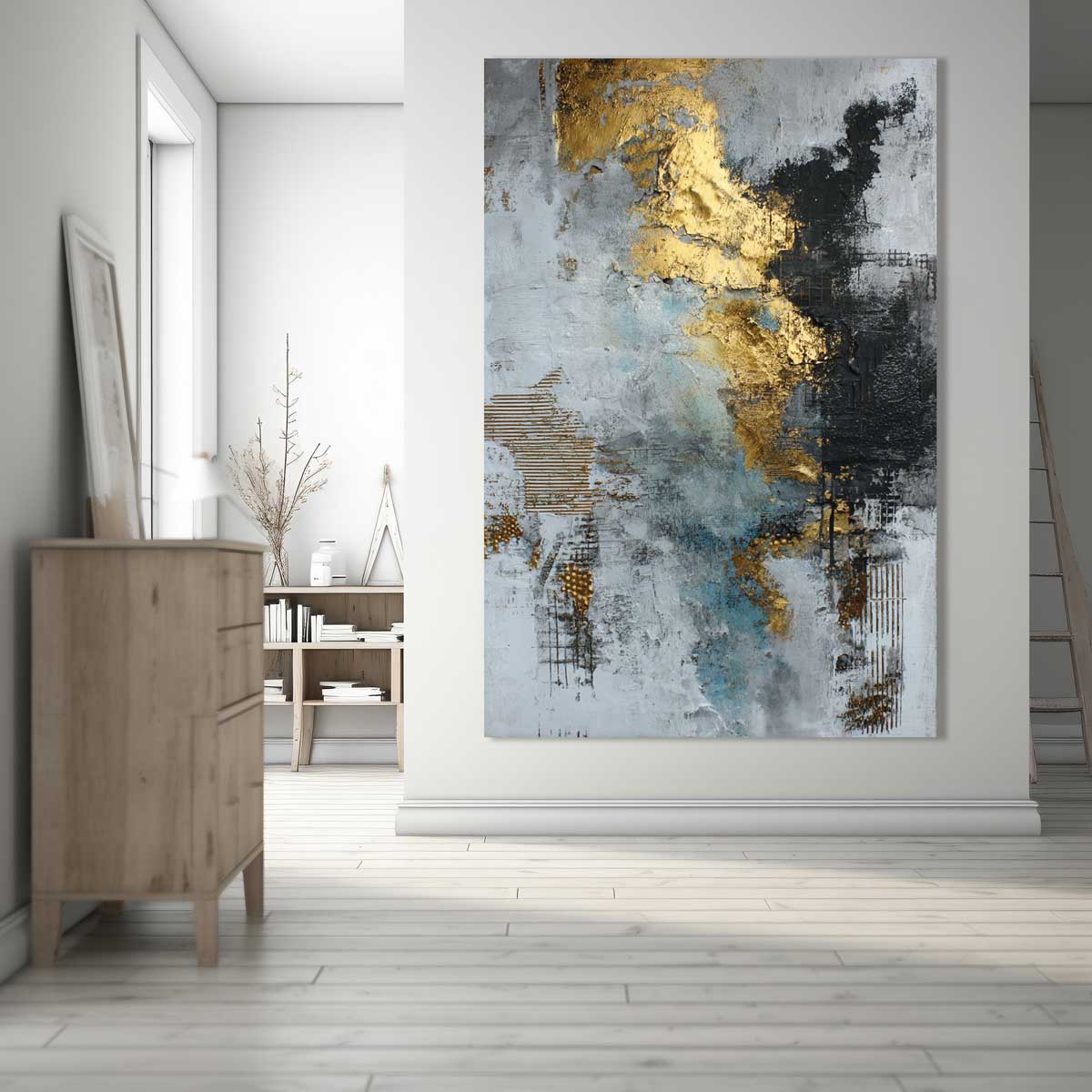 A modern vertical artwork blending cool gray, deep black, and rich blue tones. Its standout feature – glossy golden details coated with lacquer, catching the light and adding depth and elegance to the composition.