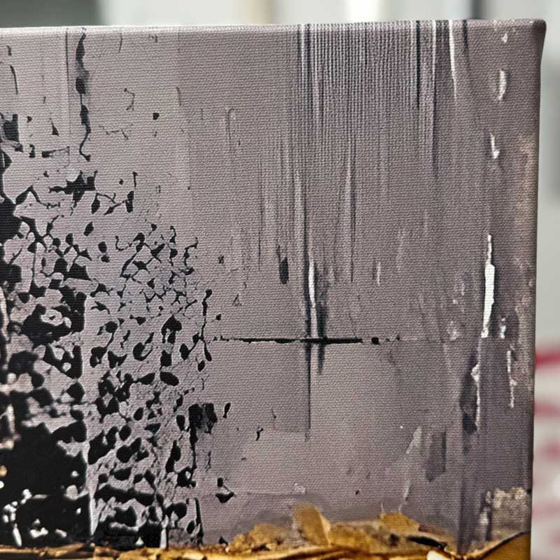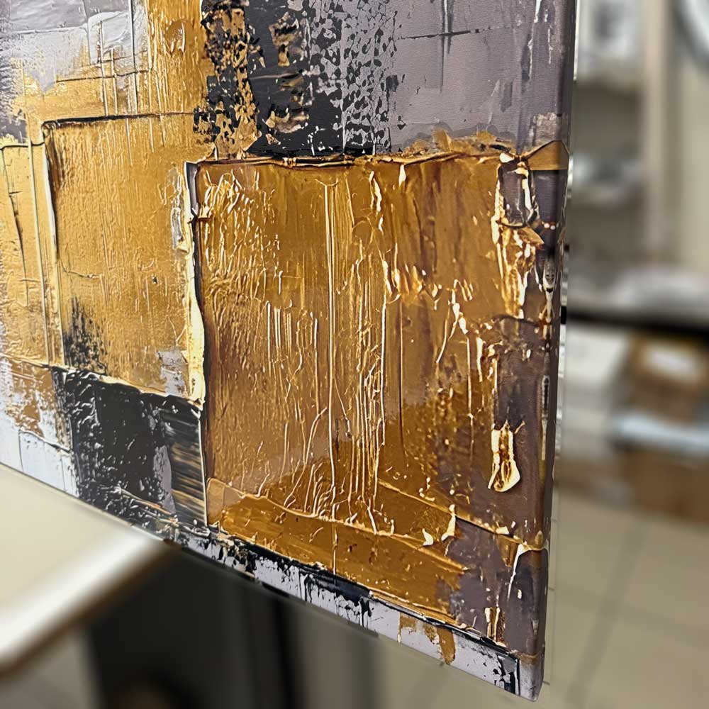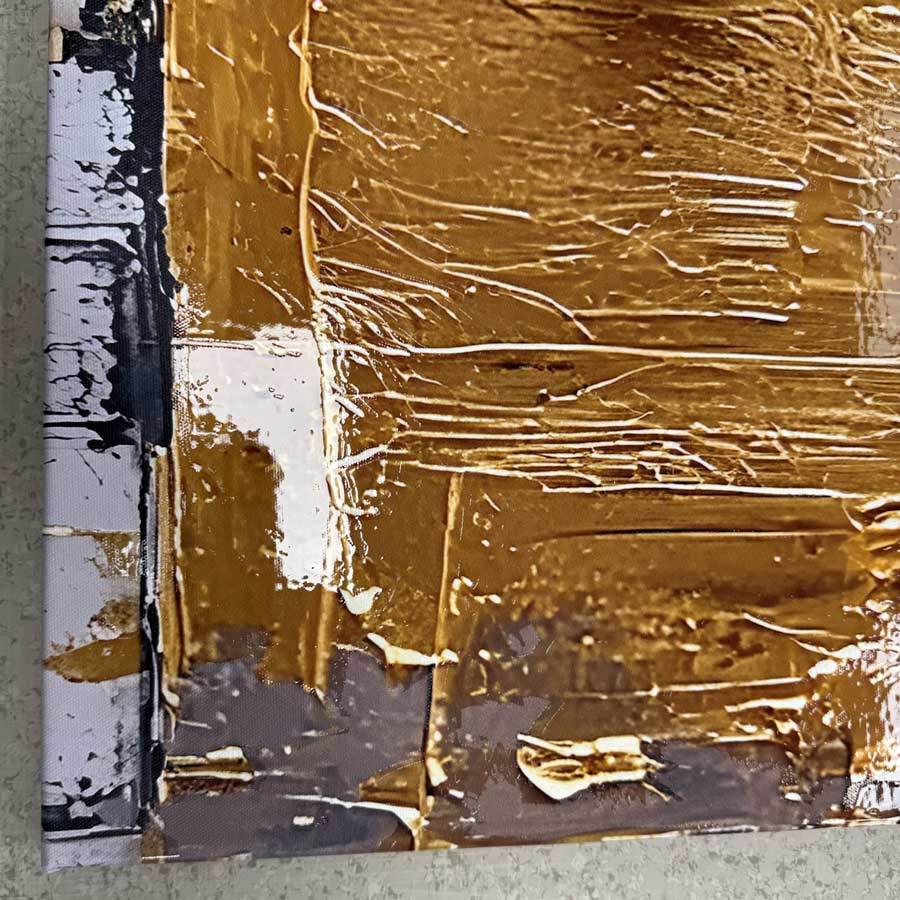 Ryškus, modernus paveikslas, kuriame dominuoja pilki tonai ir išraiškingos auksinės formos. Auksinės detalės padengtos blizgiu laku – suteikia gylio ir šviesos žaismo efektą, kuris keičiasi priklausomai nuo kampo. Šis kūrinys traukia akį ir tampa stipriu akcentu tiek svetainėje, tiek biure ar miegamajame.