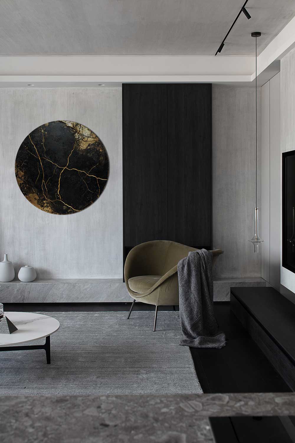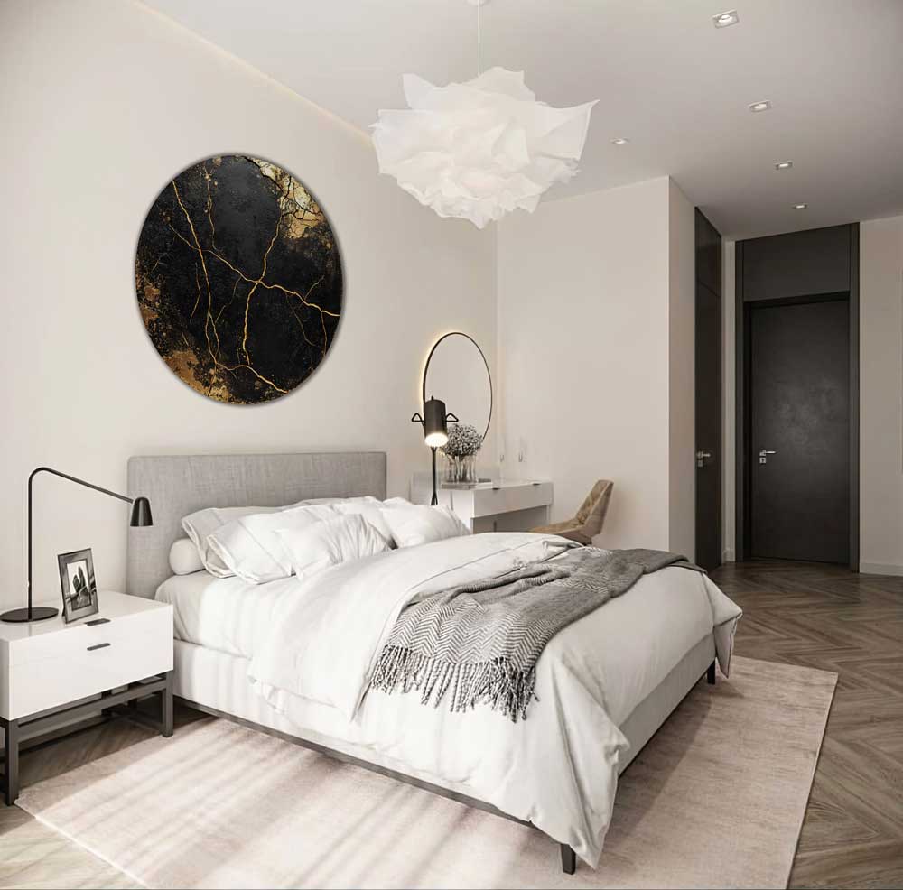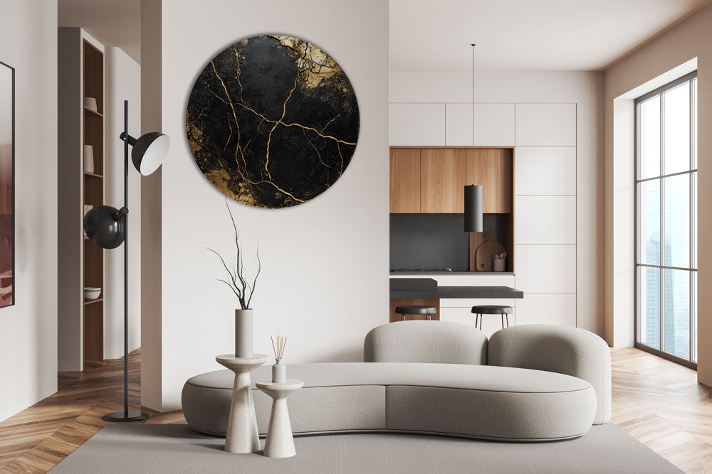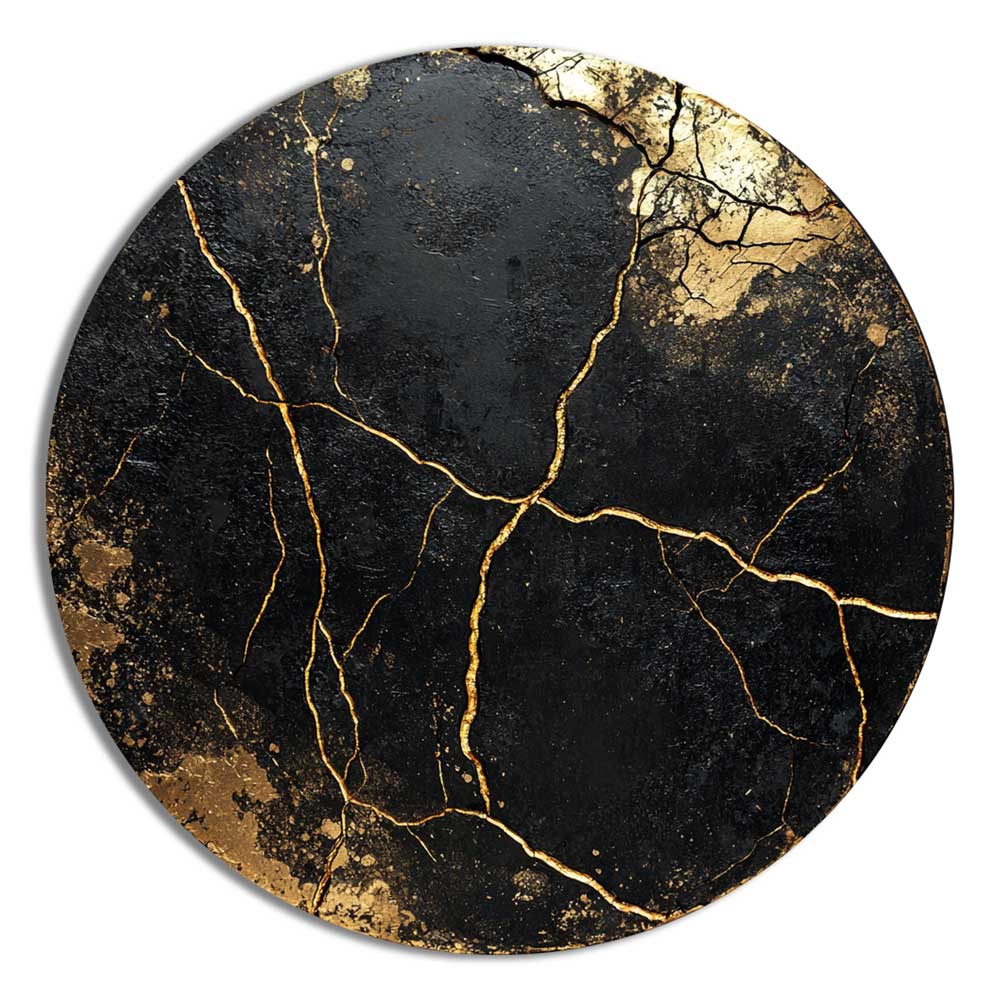Apvalus paveikslas „Auksiniai Lūžiai“ – tarsi žemės gyslomis išraižyta kompozicija. Gilūs juodi tonai kontrastuoja su įtrūkusiu auksu, kuris padengtas specialiu laku – detalės žvilga priklausomai nuo apšvietimo kampo.
