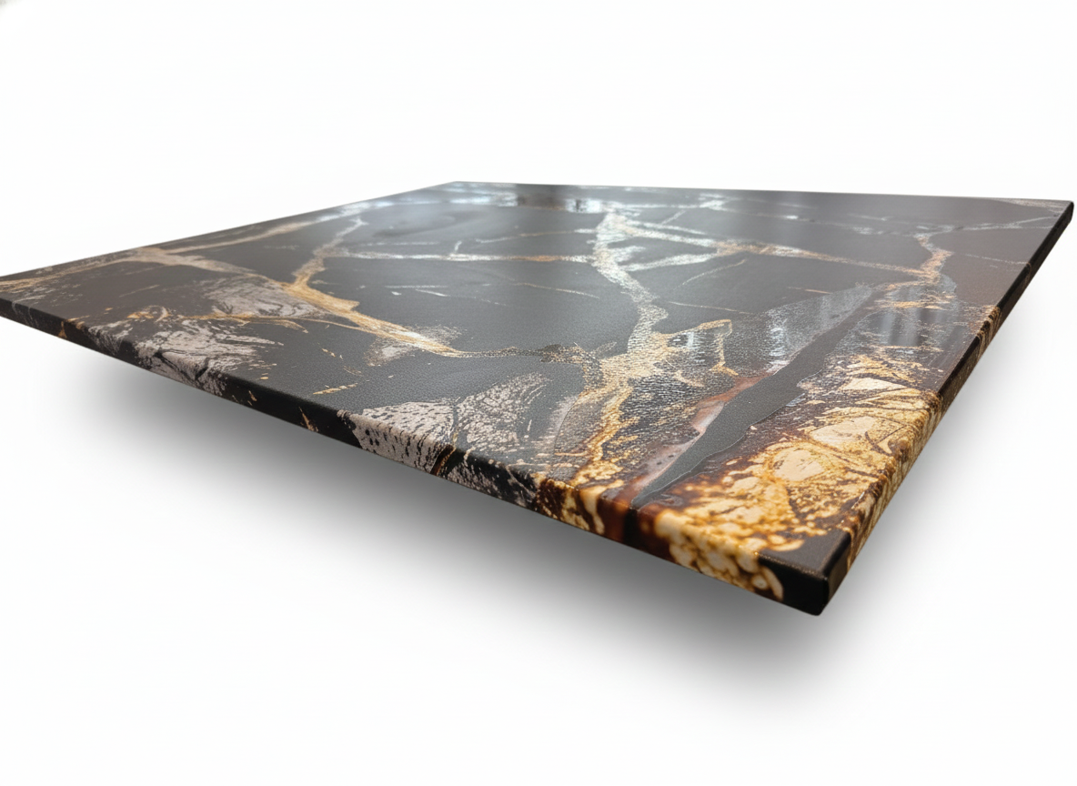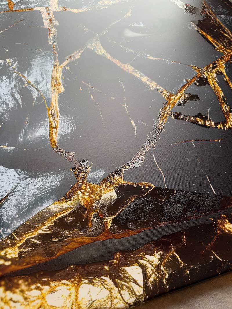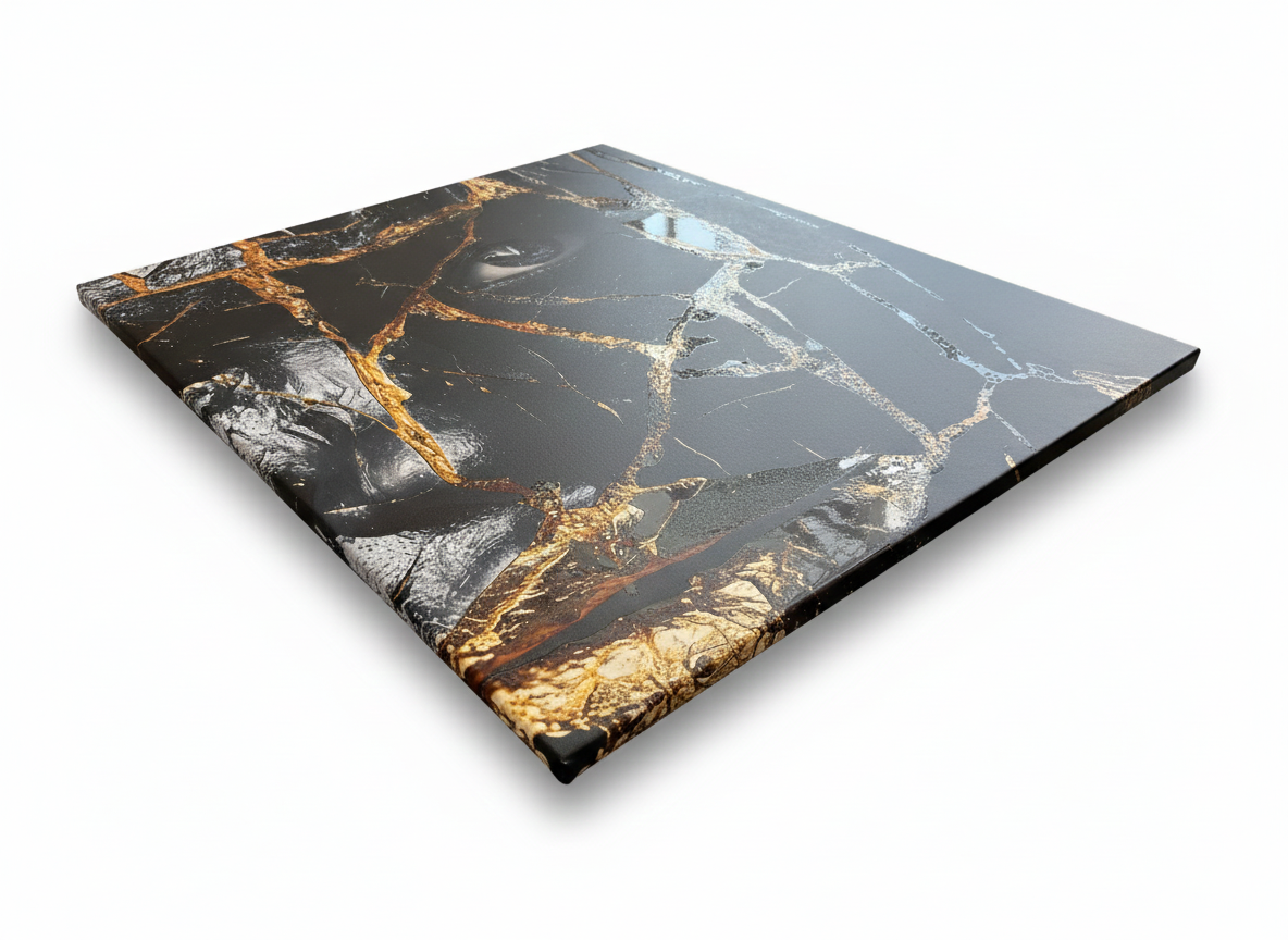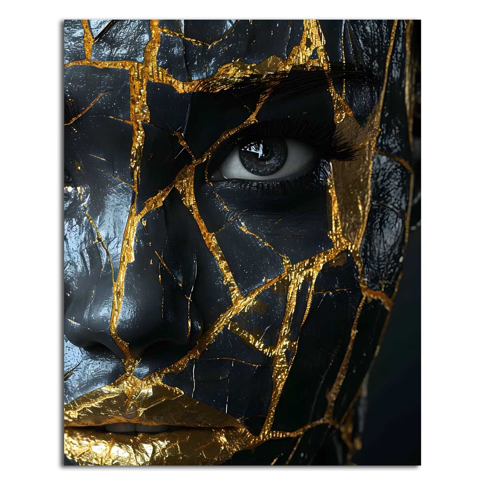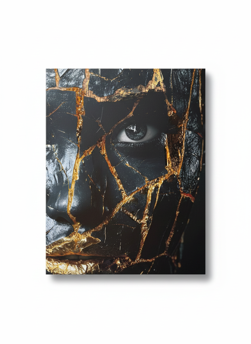Juodas portretas, išraižytas auksinėmis marmuro linijomis, kurios švyti šviesoje dėl blizgaus lako efekto. Tai ne tik paveikslas – tai galingas meno pareiškimas, jungiantis tamsą ir šviesą, trapumą ir jėgą. Aukso detalės padengtos laku, todėl sukuriamas vizualus gylis, struktūra ir šviesos žaismas, o profesionalus spausdinimas ant natūralios drobės suteikia autentiškumo.