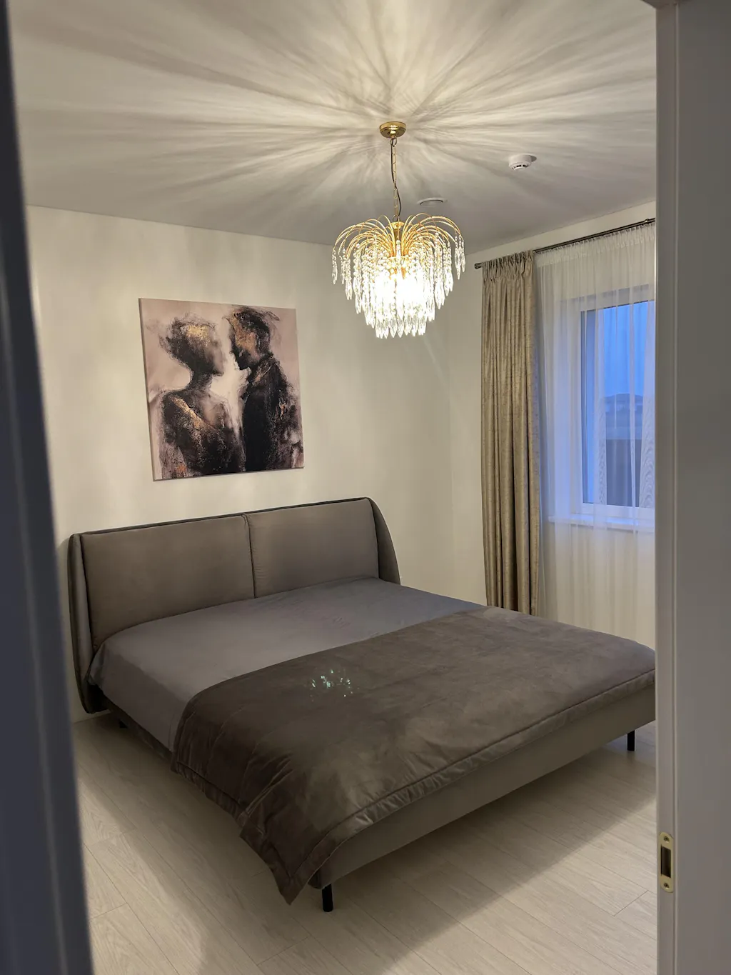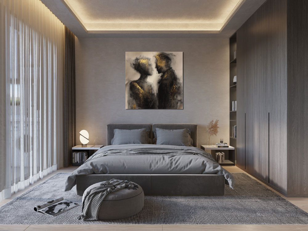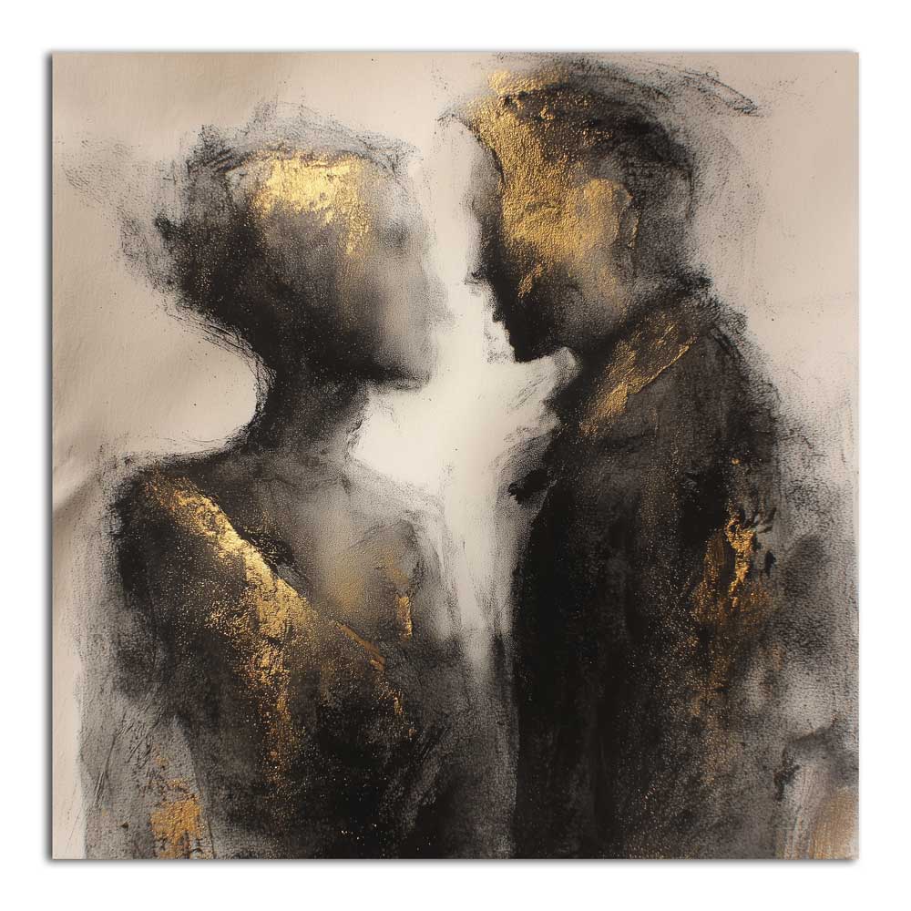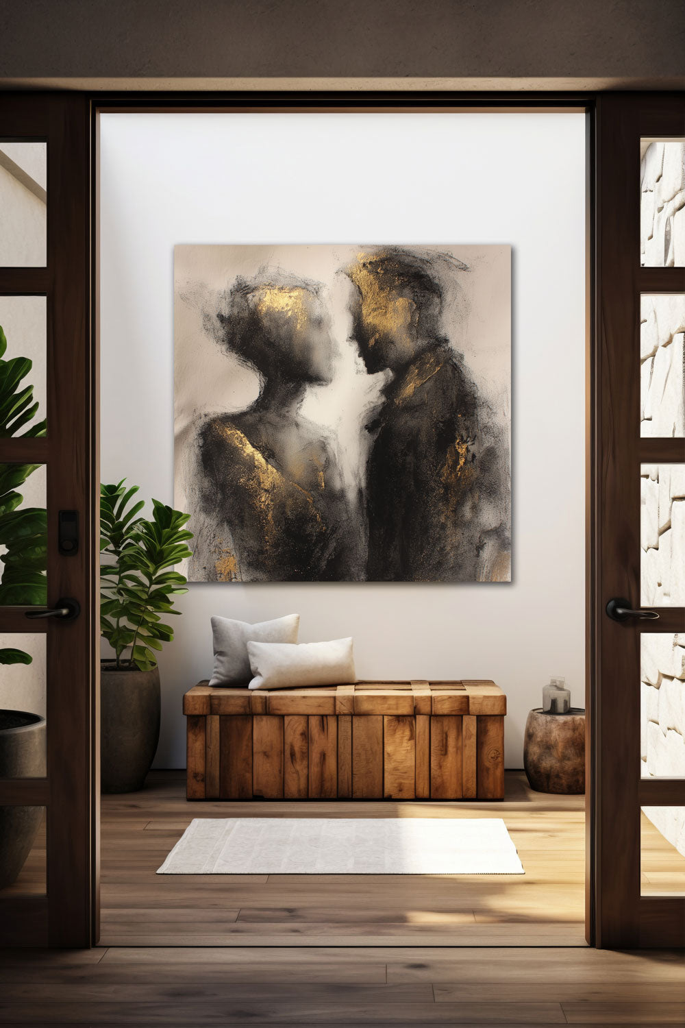 Susiliejantys siluetai, tamsūs potėpiai ir subtilūs auksiniai lako akcentai kuria tylų dialogą apie artumą, pasitikėjimą ir neišsakytas emocijas. Šis paveikslas į interjerą įneša ramybės, šilumos ir prabangios tylos pojūtį.