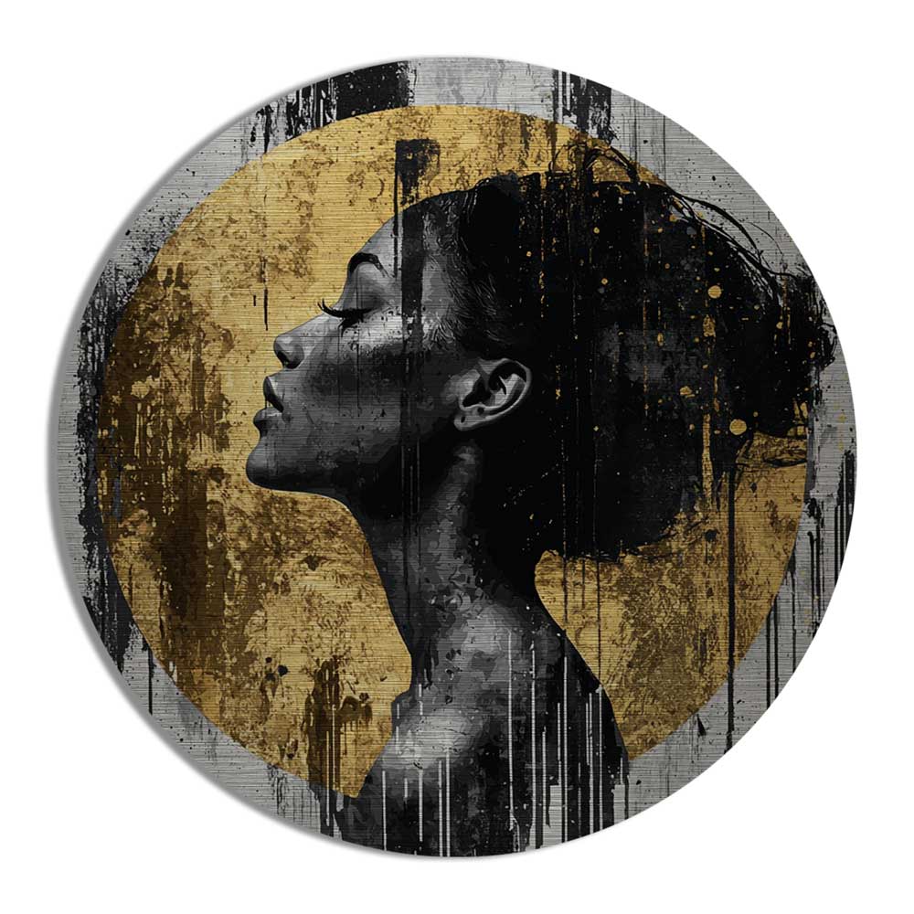 Modernus apvalios formos portretas, kuriame juoda ir aukso spalvos susilieja į stiprų, bet subtilų vaizdą. Auksinės detalės padengtos laku, todėl šviesoje jos įgauna blizgų, išraiškingą efektą. Paveikslas tampa ne tik dekoracija, bet ir emociniu akcentu tavo interjere.