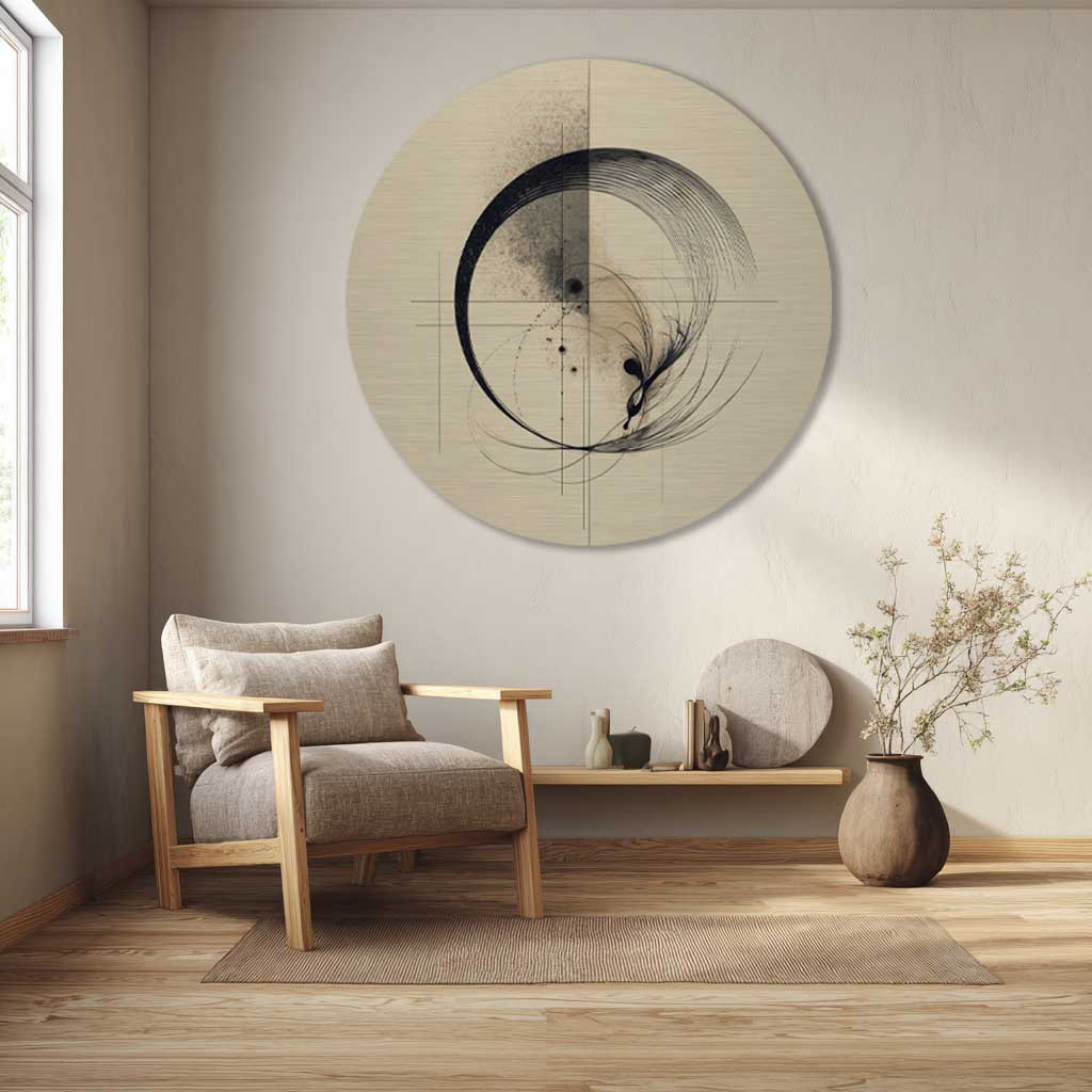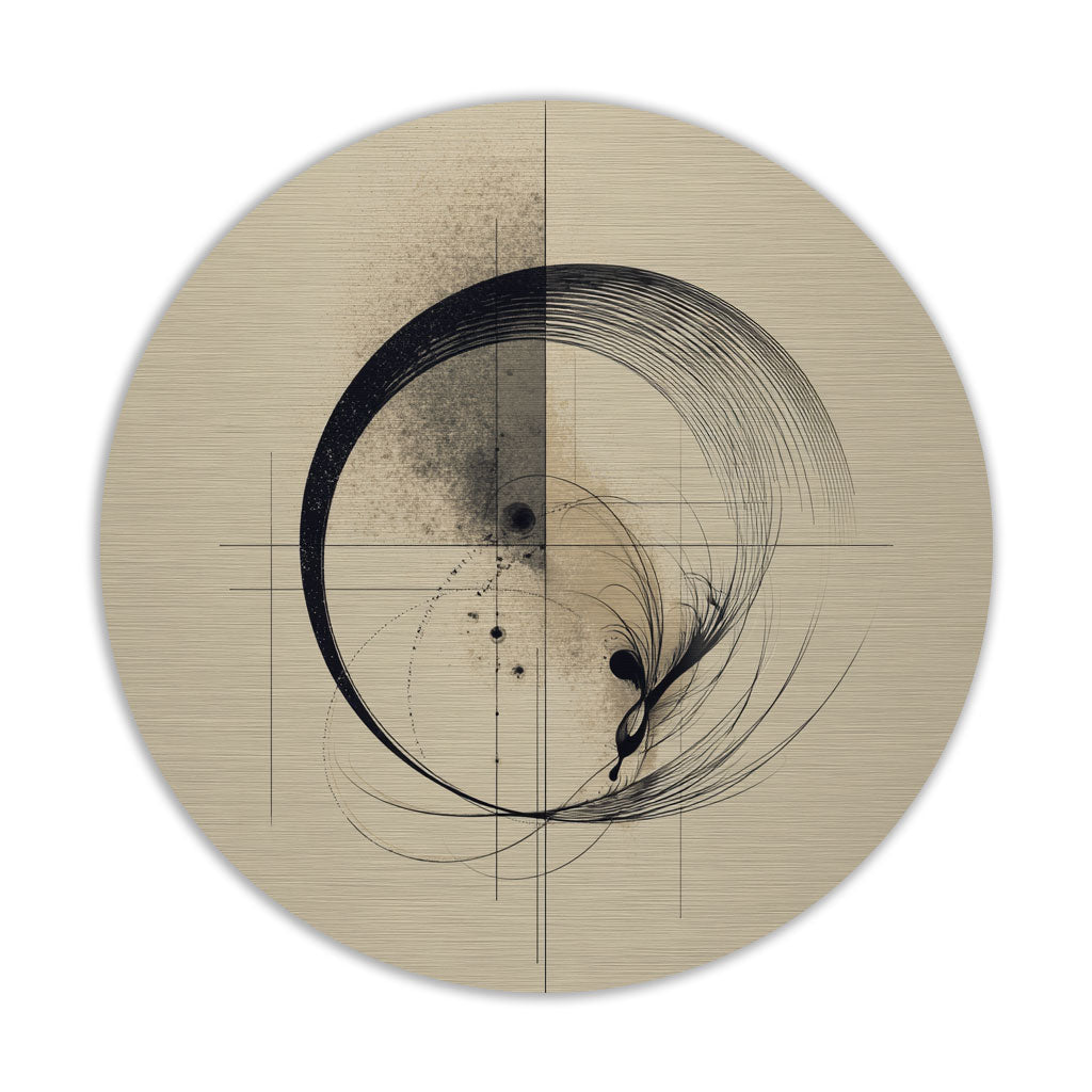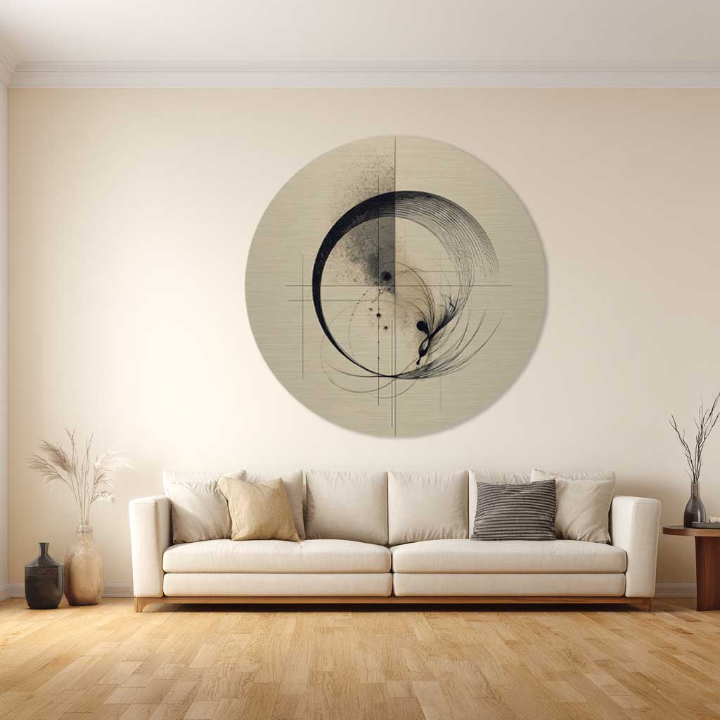 Abstraktus apvalus paveikslas „Gravitacijos Linija“ – minimalizmo ir dinamikos susidūrimas. Juodi sūkuriai, švelnūs šešėliai ir aiškiai brėžiamos linijos – viskas jungiasi į nepaprastai modernų vizualą, kuris įtraukia žvilgsnį tarsi gravitacija.