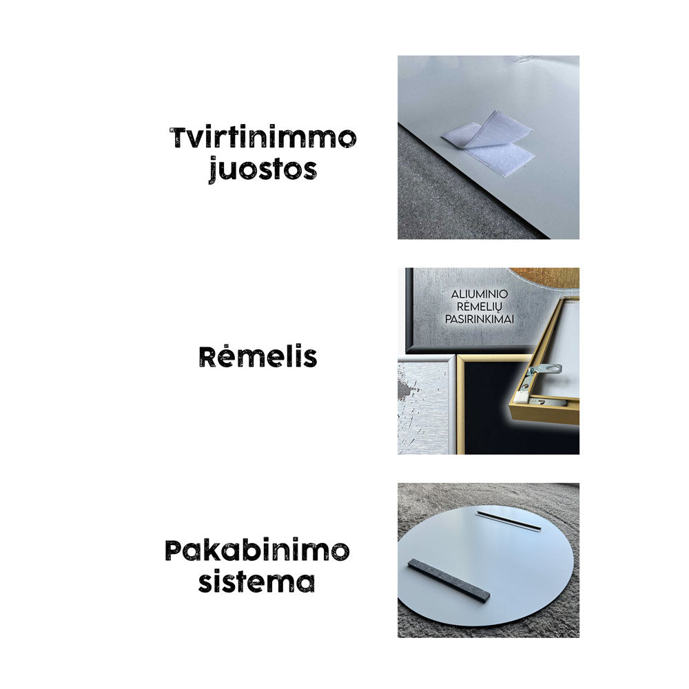 ✔ Galima papildomai įsigyti aliuminio rėmelį – montuojamas kartu su paveikslu, leidžia kabinti klasikinio tipo būdu. Galimos spalvos: juoda, sidabrinė arba auksinė