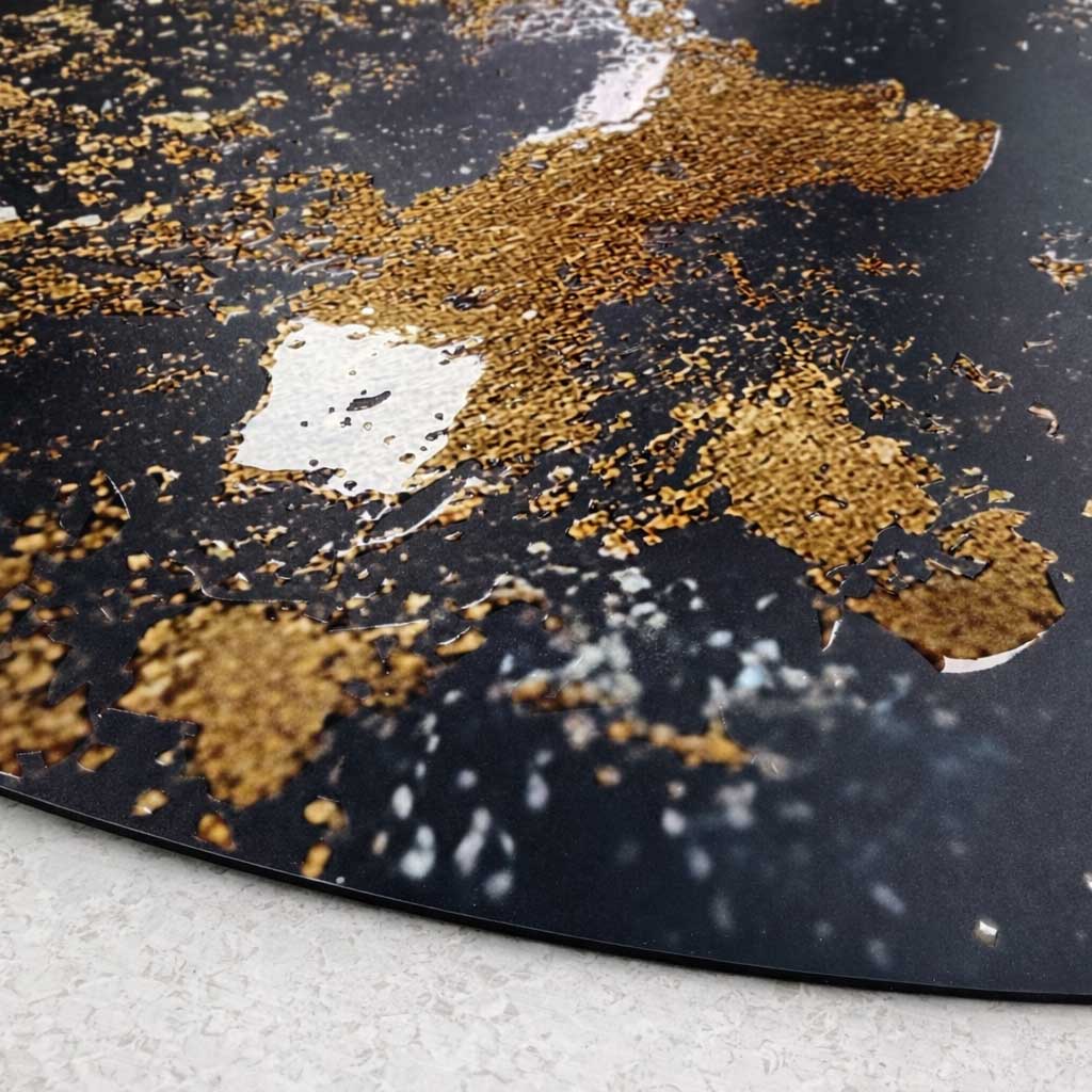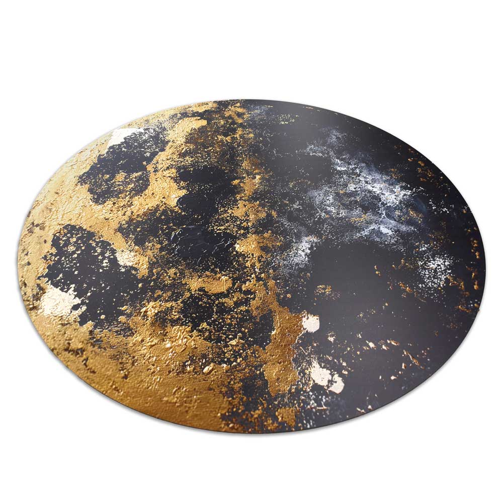 Tarsi dangaus kūnas – šiame paveiksle susilieja juoda tekstūra ir auksinės detalės, kurios padengtos blizgiu laku. Paviršius atrodo tarsi gyvas, kintantis priklausomai nuo šviesos kampo. Tai stiprus interjero akcentas moderniai erdvei.