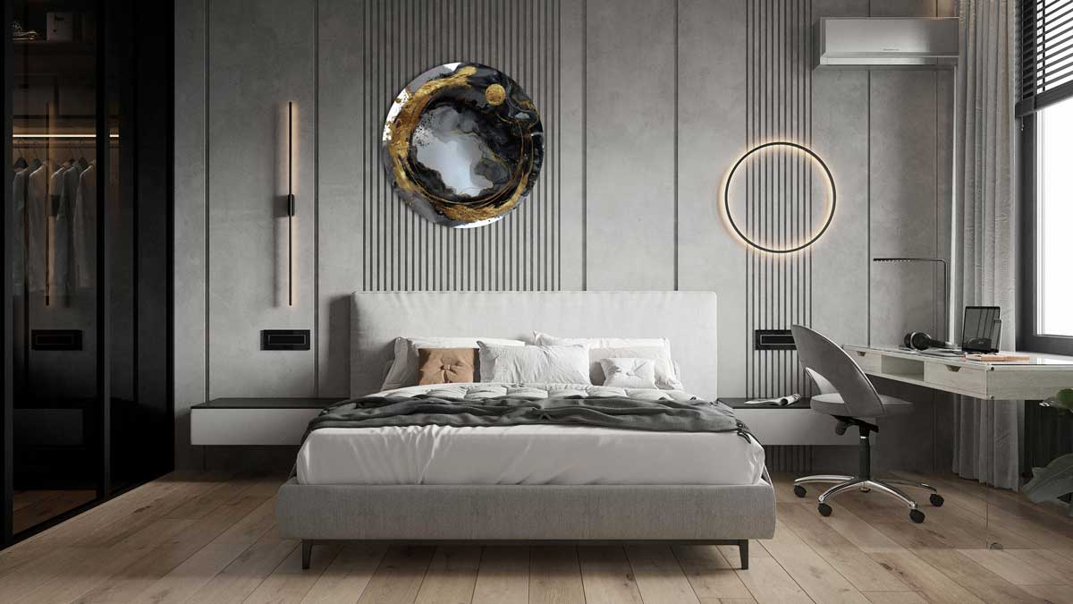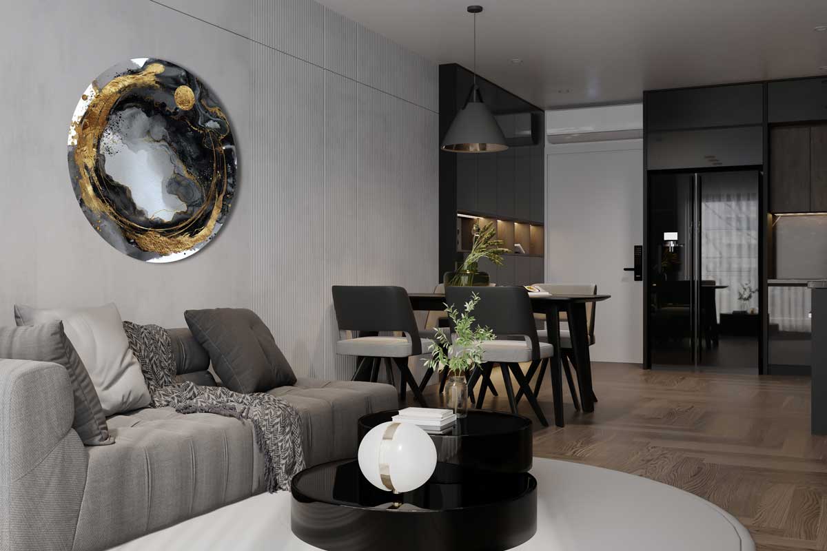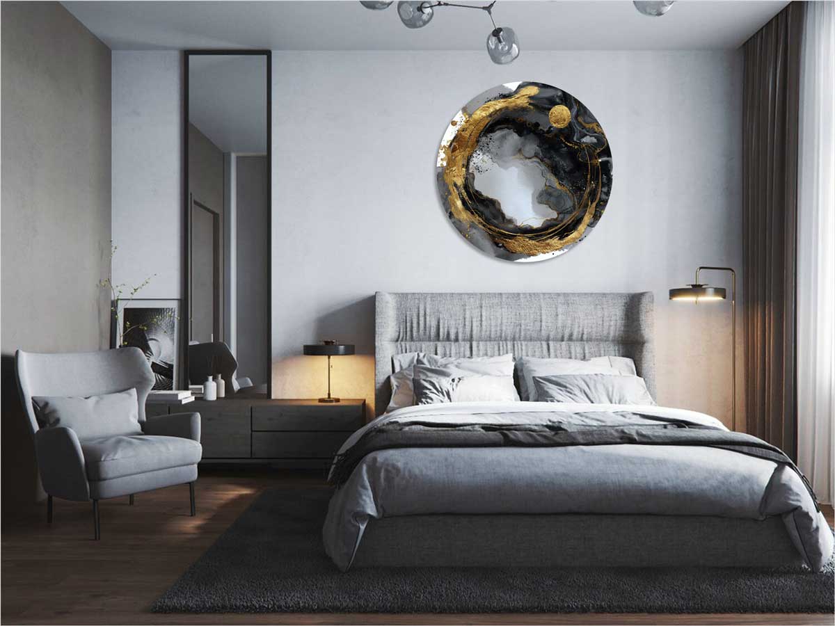 Tarsi iš kosmoso – paveikslas „Kosminis Sukūris“ traukia akį galinga juodai-pilka spalvų tėkme, kurią sustiprina auksinės lako detalės. Apvali forma, metalinis paviršius ir žvilgantis lakas kuria modernų bei išskirtinį įspūdį bet kurioje erdvėje.