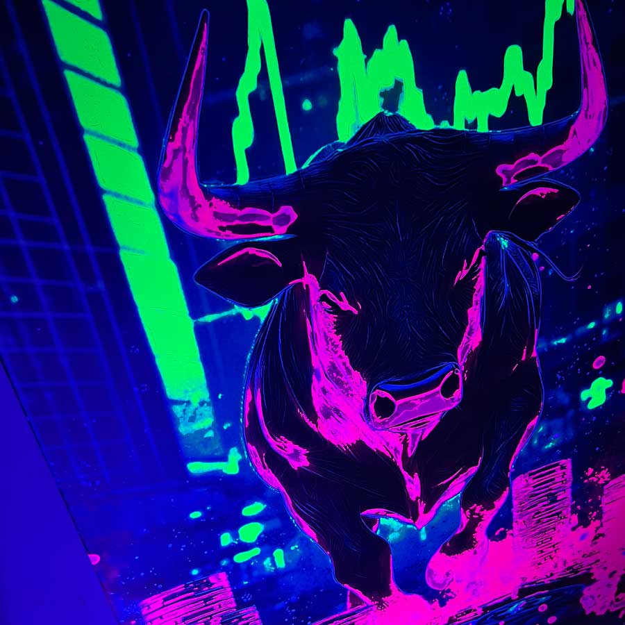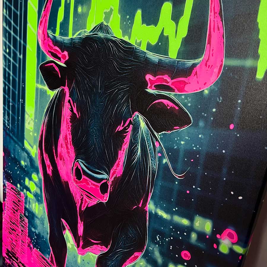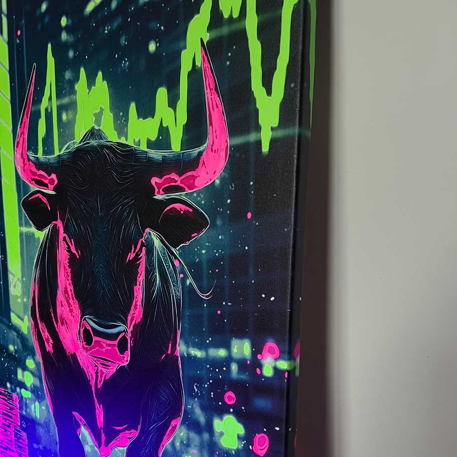 Šis paveikslas sukurtas kripto pasaulio įkvėptiems žmonėms. Ryškus bulius tarp žalių grafikų ir neoninių monetų perteikia tikrą „bullrun“ nuotaiką. Neoniniai dažai reaguoja į UV šviesą – vaizdas atgyja, kai apšviečiamas. Puikiai tinka ofisui, studijai ar šiuolaikiškam interjerui.