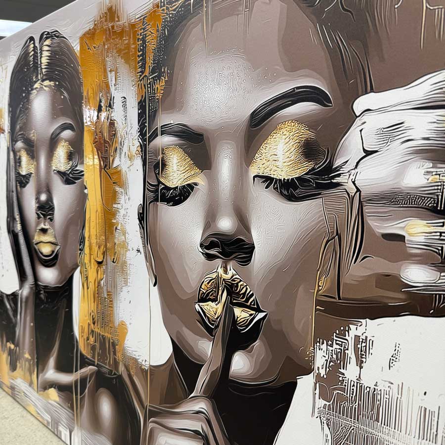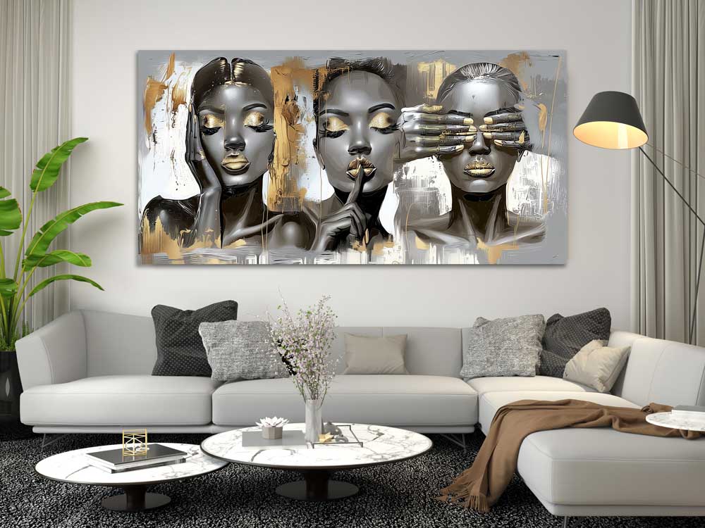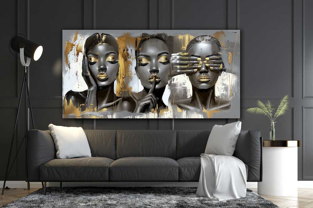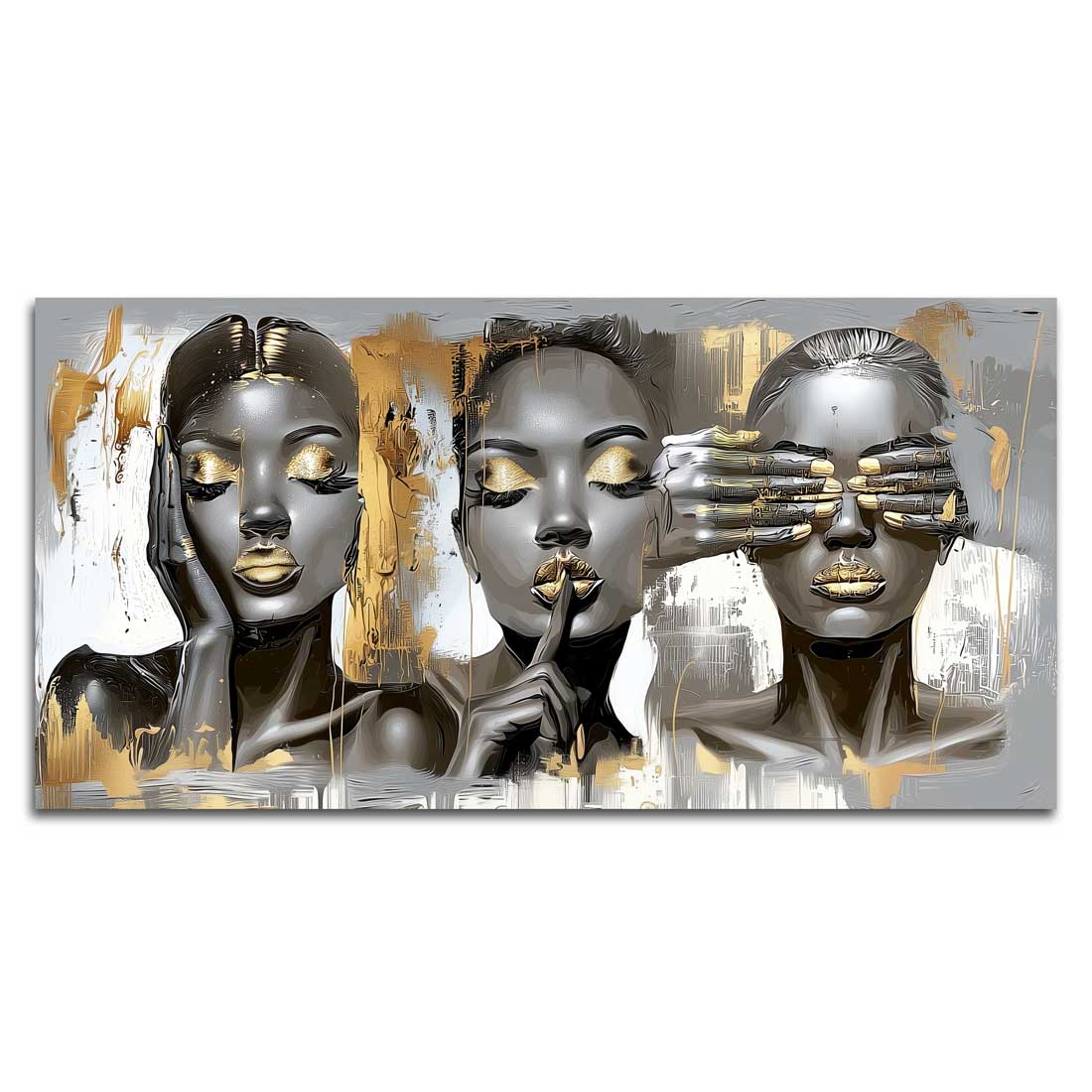 Šiuolaikiškas portretas, kuriame trys moters siluetai sujungti į vieną kontrastingą kompoziciją. Pilkšvai baltas fonas, aukso spalvos akcentai ir šviesoje spindinčios lako detalės sukuria išraiškingą, bet subtilų efektą. Horizontalus formatas puikiai dera virš sofos, lovos ar svetainės sienos.