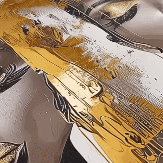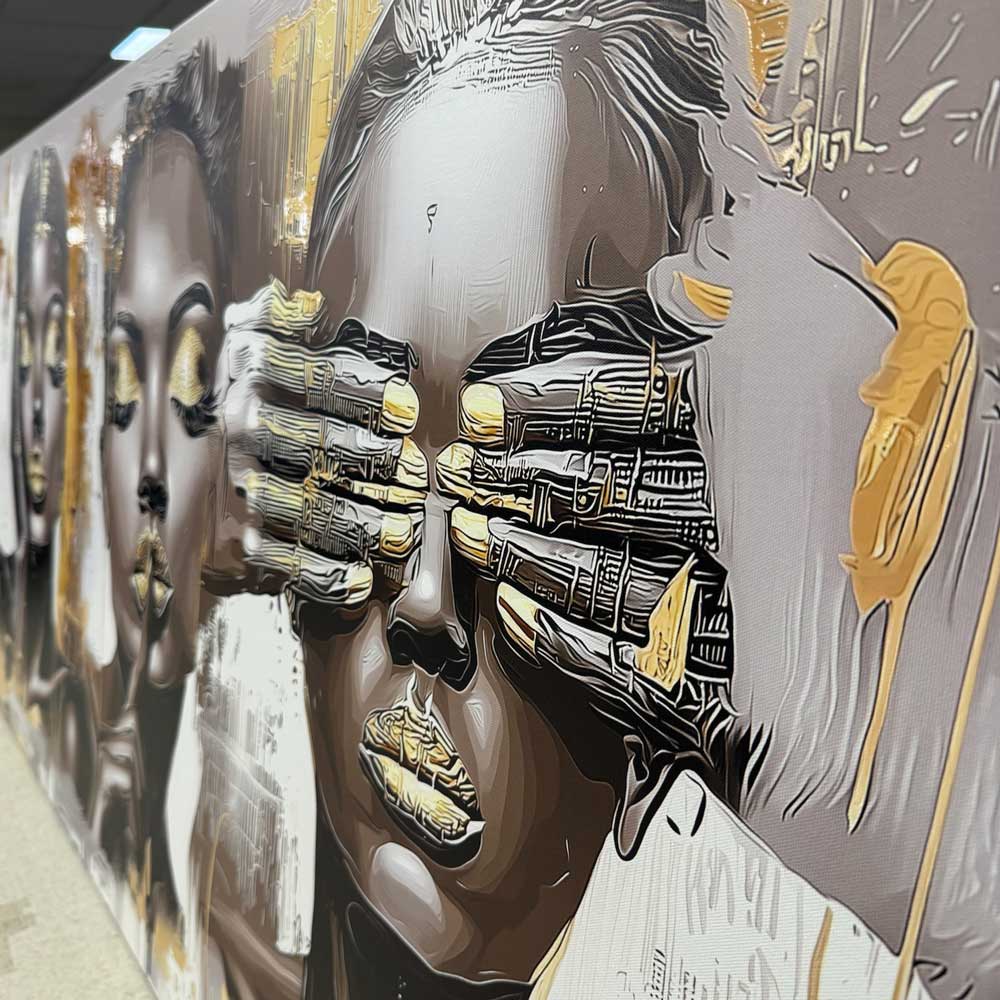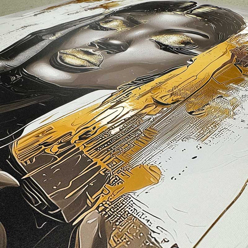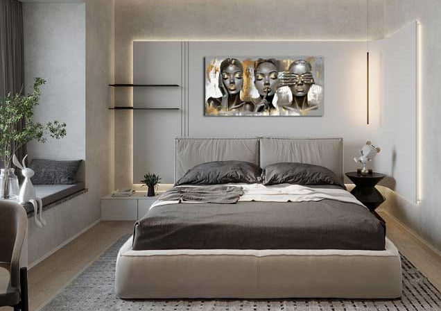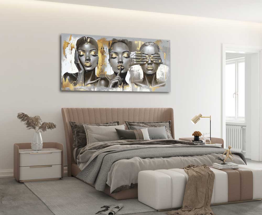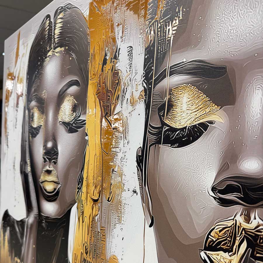 Šiuolaikiškas portretas, kuriame trys moters siluetai sujungti į vieną kontrastingą kompoziciją. Pilkšvai baltas fonas, aukso spalvos akcentai ir šviesoje spindinčios lako detalės sukuria išraiškingą, bet subtilų efektą. Horizontalus formatas puikiai dera virš sofos, lovos ar svetainės sienos.