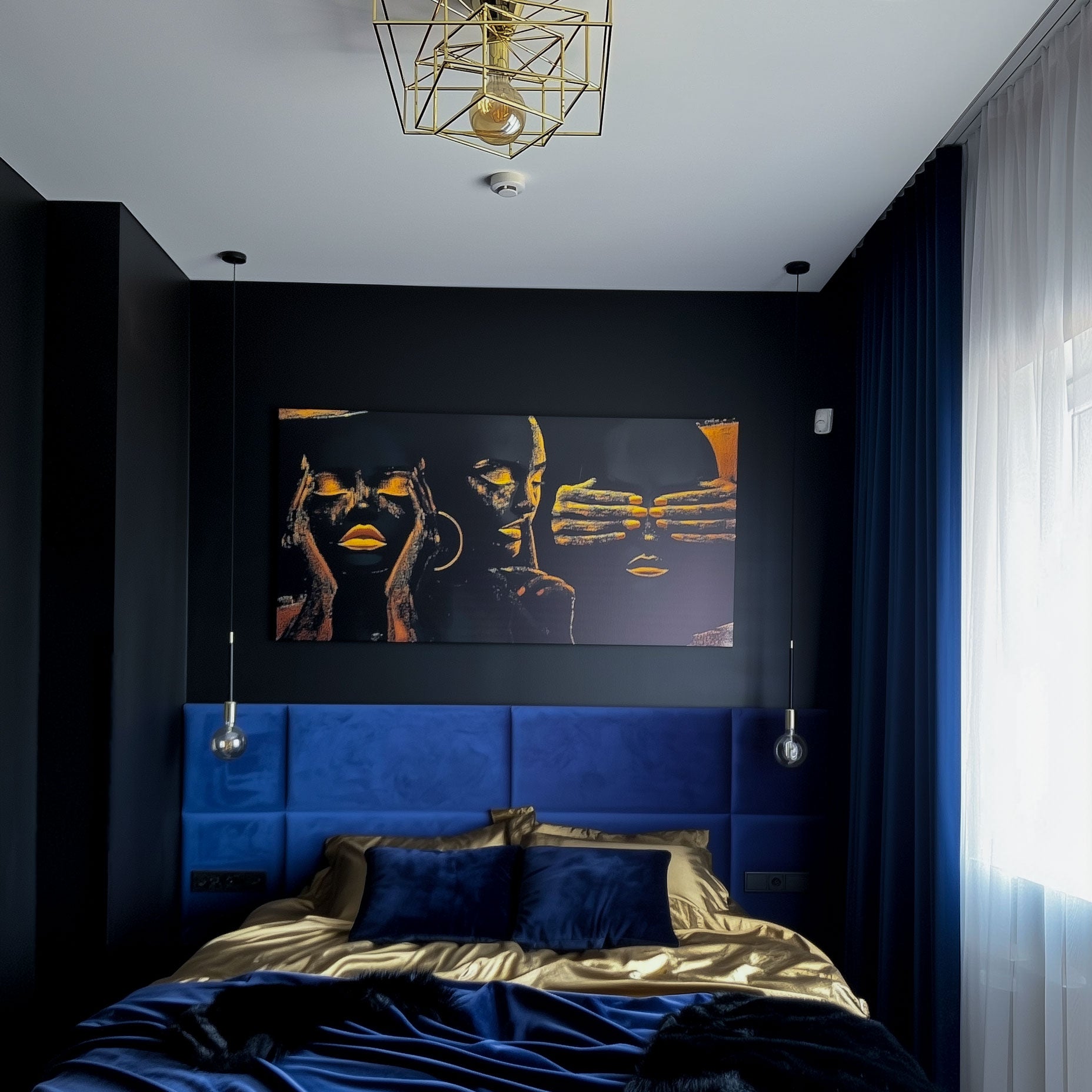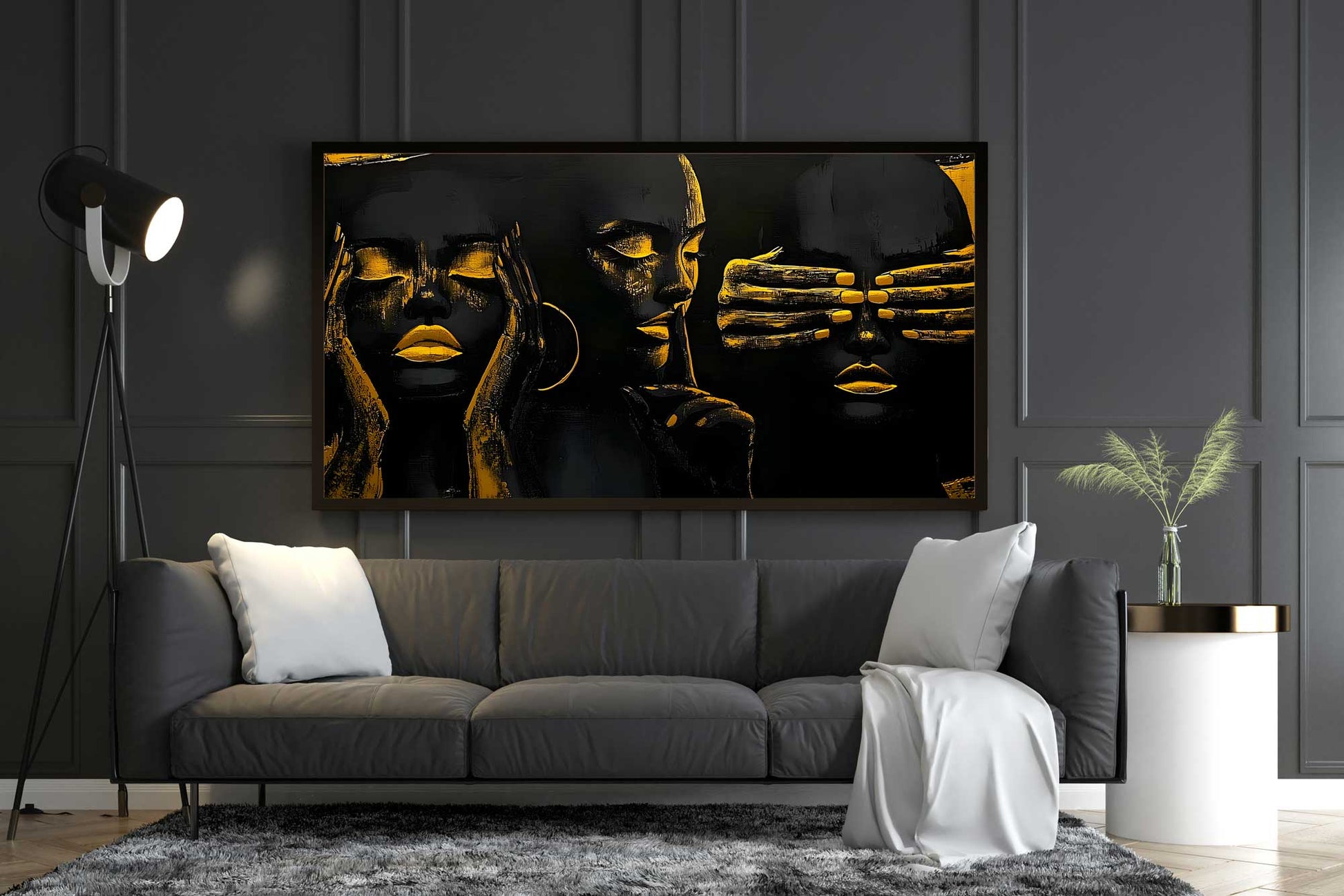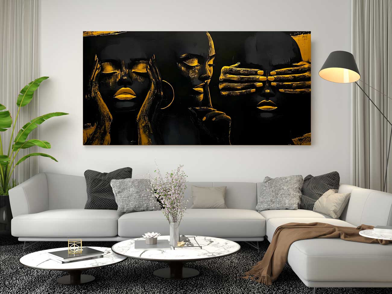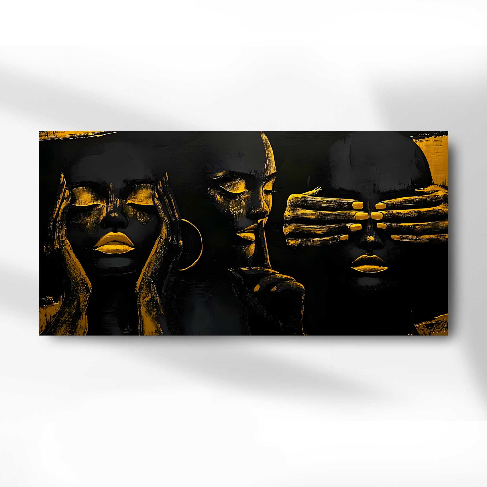 Simbolika, kuri prabyla vaizdu. Šis modernus paveikslas, įkvėptas klasikinės „Negirdžiu, Nekalbu, Nematau“ temos, sujungia eleganciją, prabangą ir emociją viename kūrinyje. Juodi tonai su ryškiais auksiniais akcentais sukuria gilią vizualinę dramą, o detalės padengtos blizgiu laku, kuris išryškina šviesą ir tekstūrą.