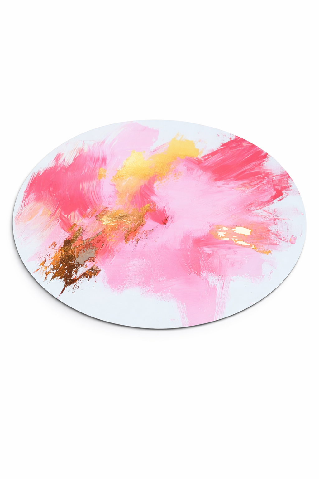 Ryškus, emocionalus ir visiškai nepakartojamas – šis apvalus paveikslas su rožiniais potėpiais ir auksinėmis lako detalėmis atneša spalvų pliūpsnį į bet kurią erdvę. Vizualinis kontrastas tarp švelnių rožinių sluoksnių ir intensyvių aukso žybsnių ne tik pagyvina interjerą, bet ir kuria energijos kupiną atmosferą.