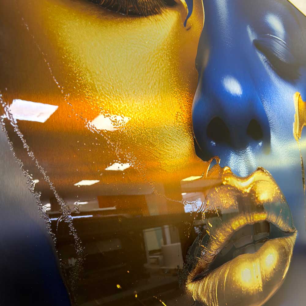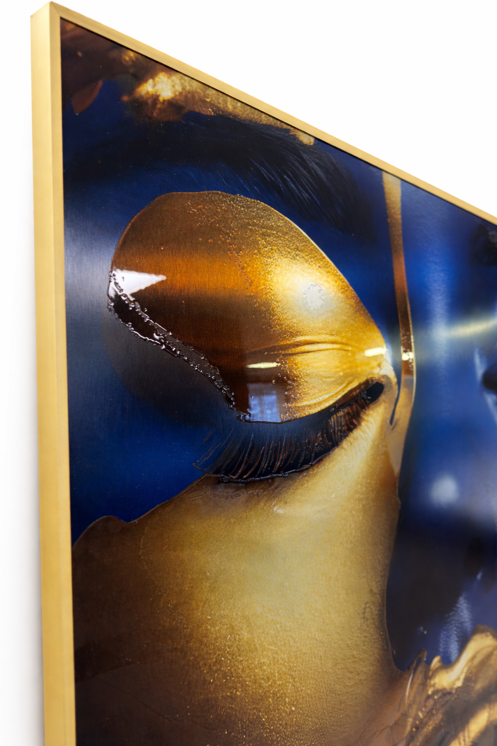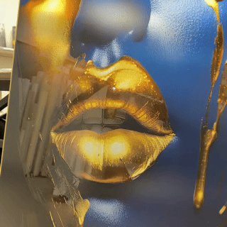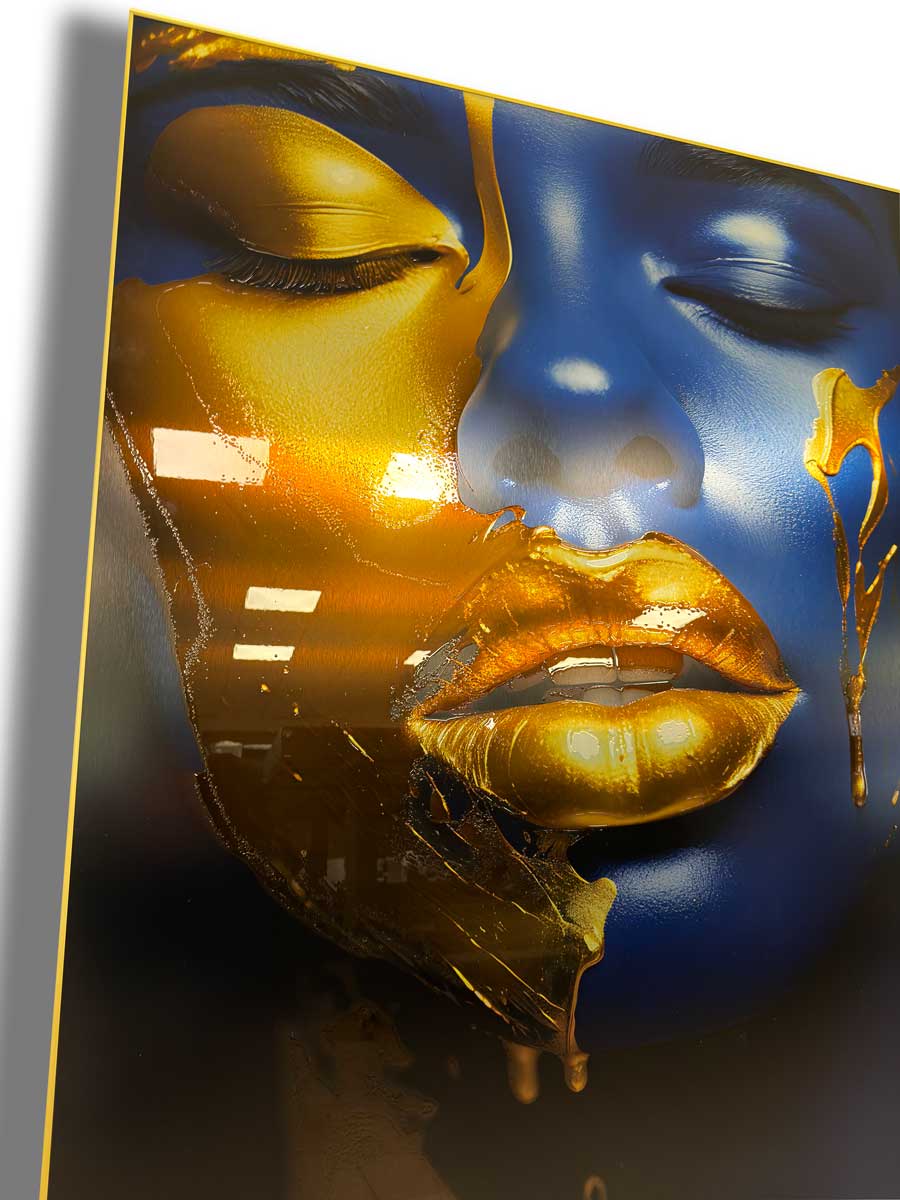 Įneškite prabangos į savo interjerą su šiuo stambaus plano meno kūriniu. Safyro mėlynumo moters veidas ir aukso detalės kuria kontrastą, kuris traukia žvilgsnį. Auksinės vietos padengtos blizgiu laku, todėl jos spindi ir sukuria gyvą, tekstūrinį efektą.
