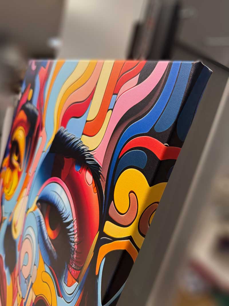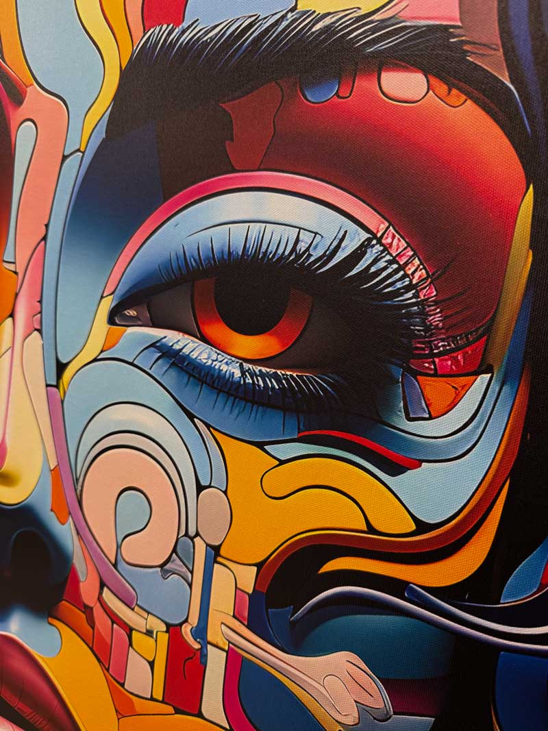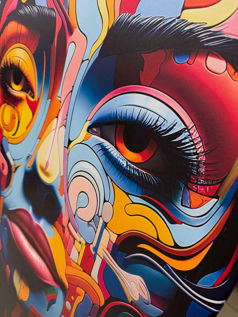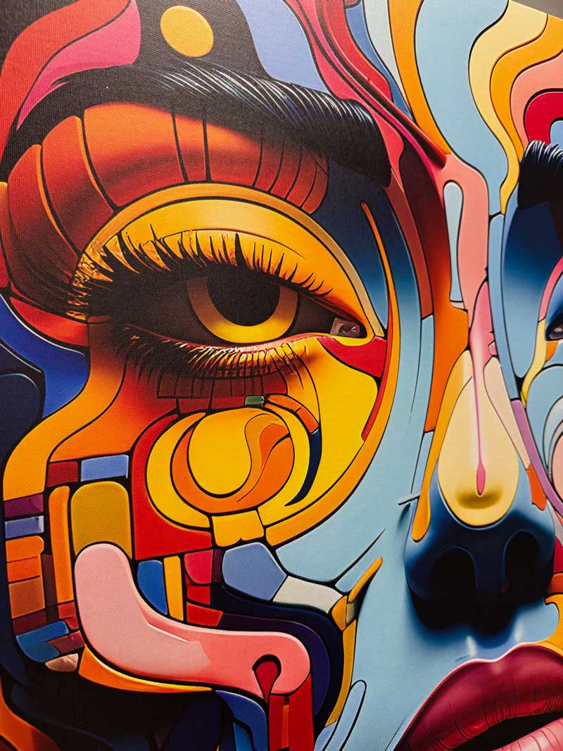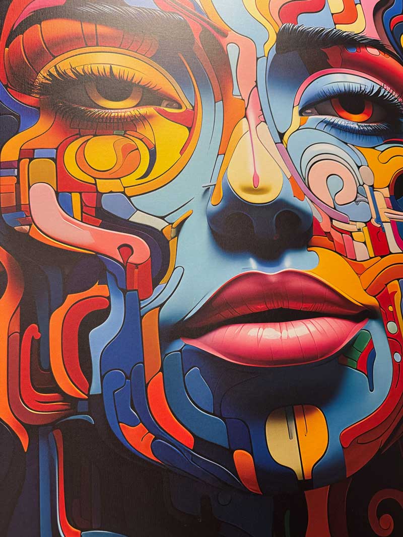 „Spalvų Žvilgsnis“ – tai išskirtinis moters portretas, sukurtas iš ekspresyvių, ryškių spalvų ir grafinių linijų. Šis drobės paveikslas kalba akimis – žvilgsnis hipnotizuojantis, o forma – drąsi ir moderni. Tai meno kūrinys, kuris nepalieka abejingų ir iškart tampa pagrindiniu akcentu interjere.