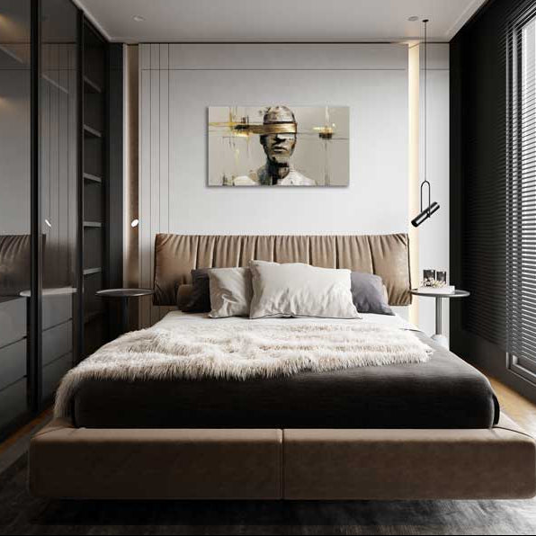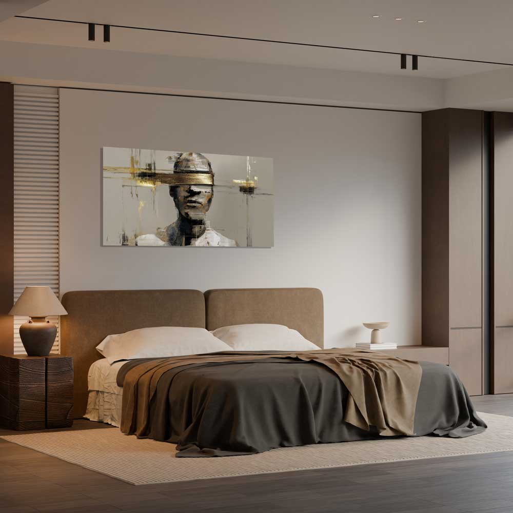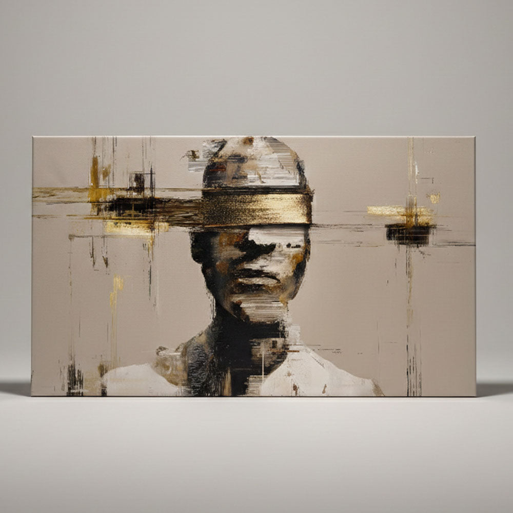 Šis paveikslas fiksuoja vidinę pauzę – akimirką, kai mintys dar neišsakytos, bet jau juntamos. Užmerktos akys, švelniai nutrintos formos ir santūri spalvų paletė kuria susikaupimo ir vidinės pusiausvyros nuotaiką. Per visą kompoziciją einantys auksiniai akcentai suteikia gylio ir subtilios įtampos, išlaikant ramią, šiuolaikišką estetiką.