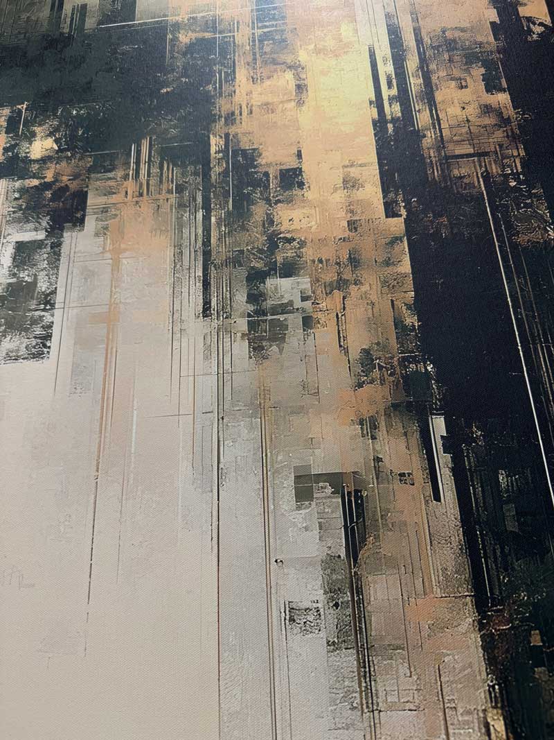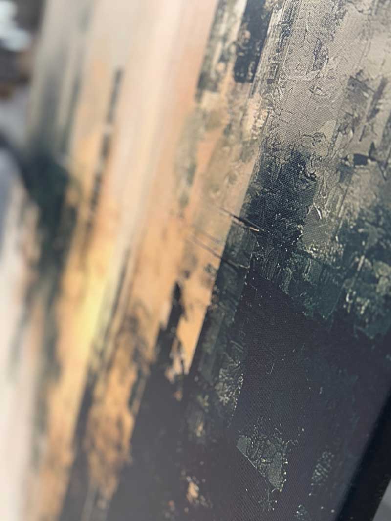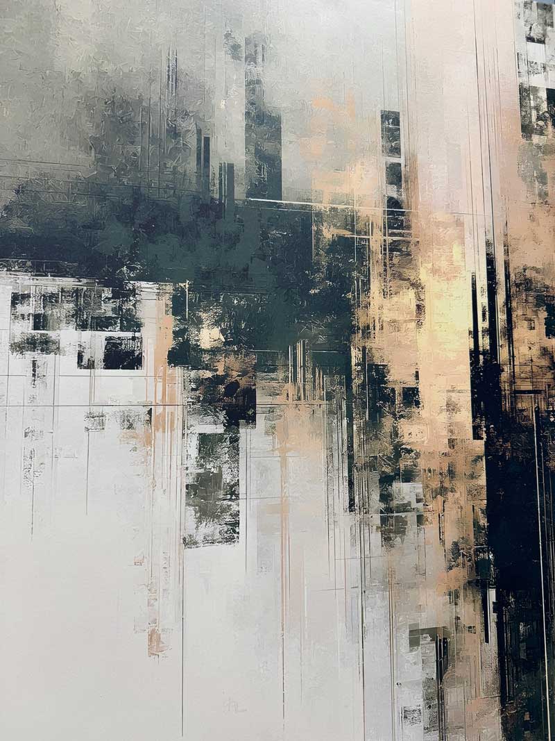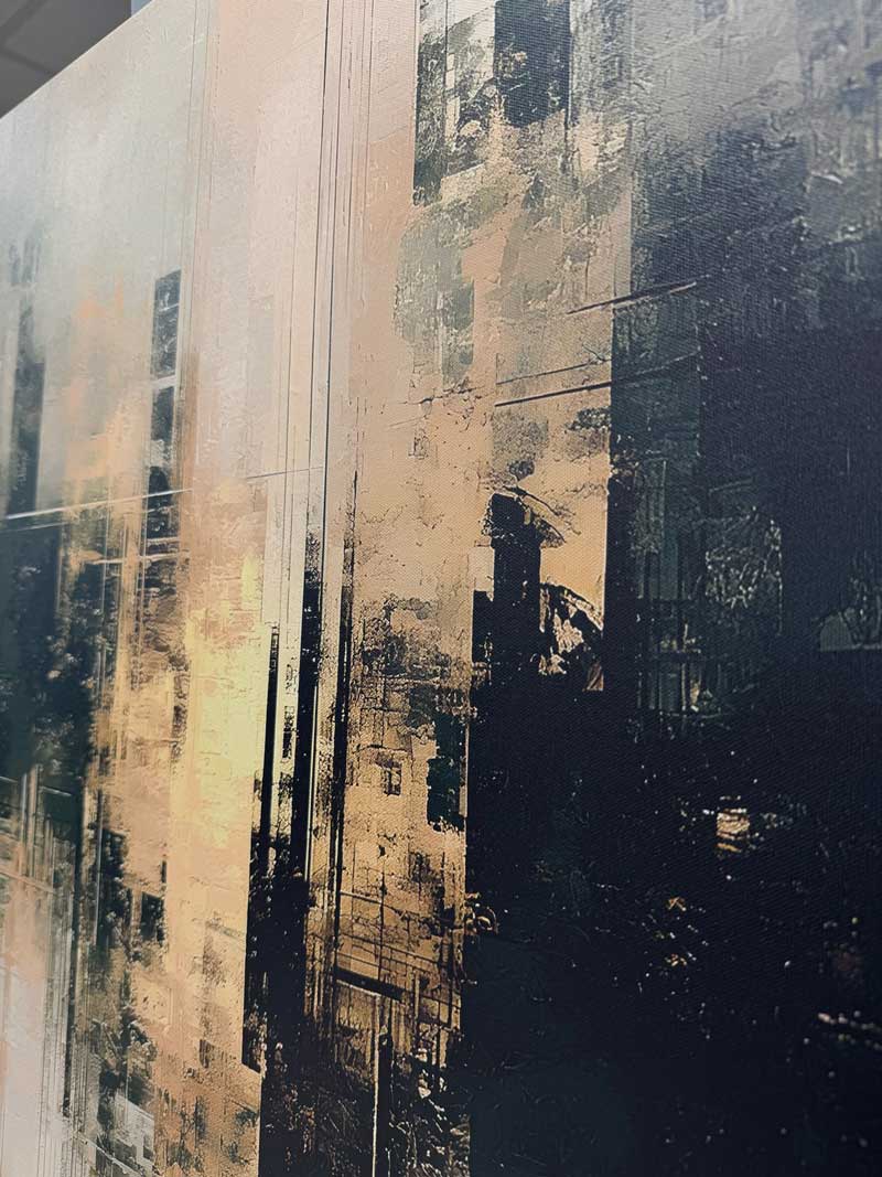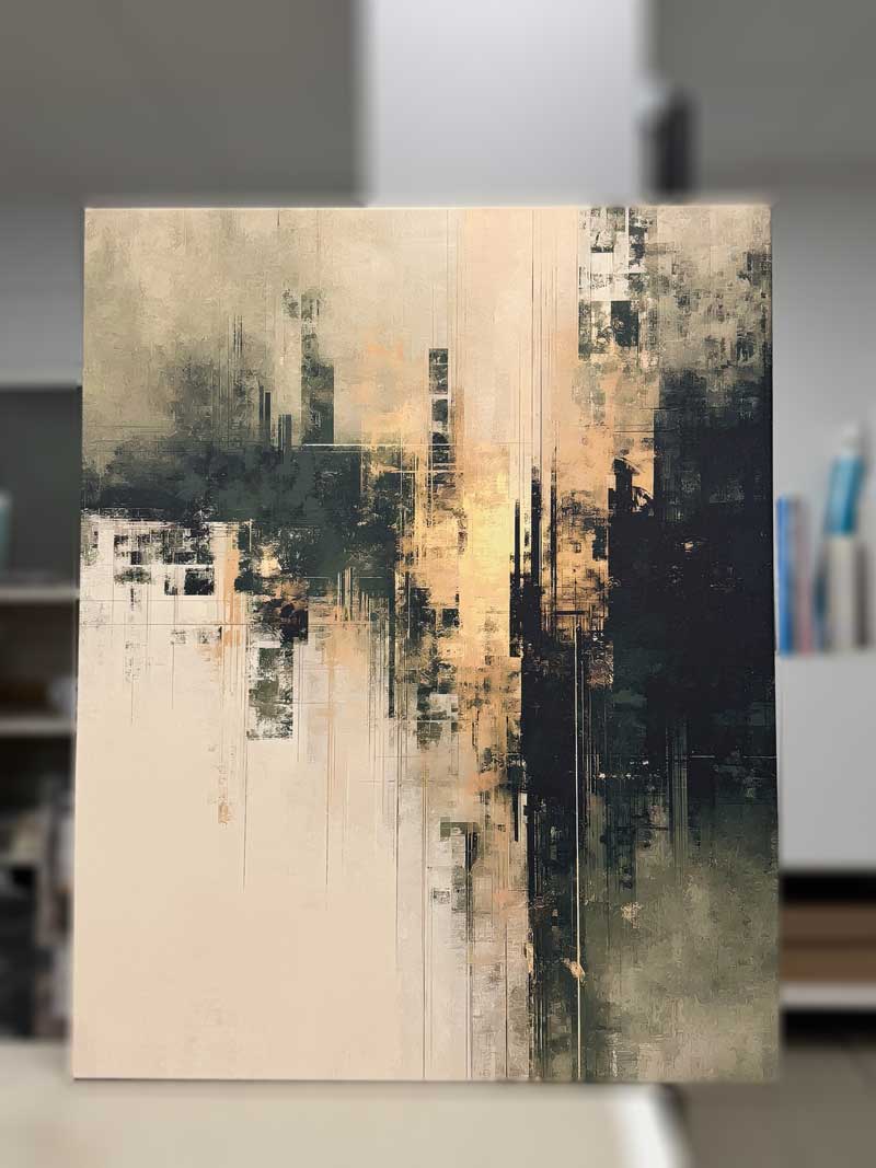 „Šviesos Struktūra“ – tai vertikalus drobės paveikslas, kuriame subtiliai susilieja smėlio, tamsiai žalios ir aukso atspalviai. Kompozicija primena miesto fragmentus ar abstrakčias formas, persmelktas šviesos. Šis kūrinys tinka tiek šviesiam, tiek kontrastingam interjerui – jis išlaiko balansą tarp elegancijos ir modernumo.